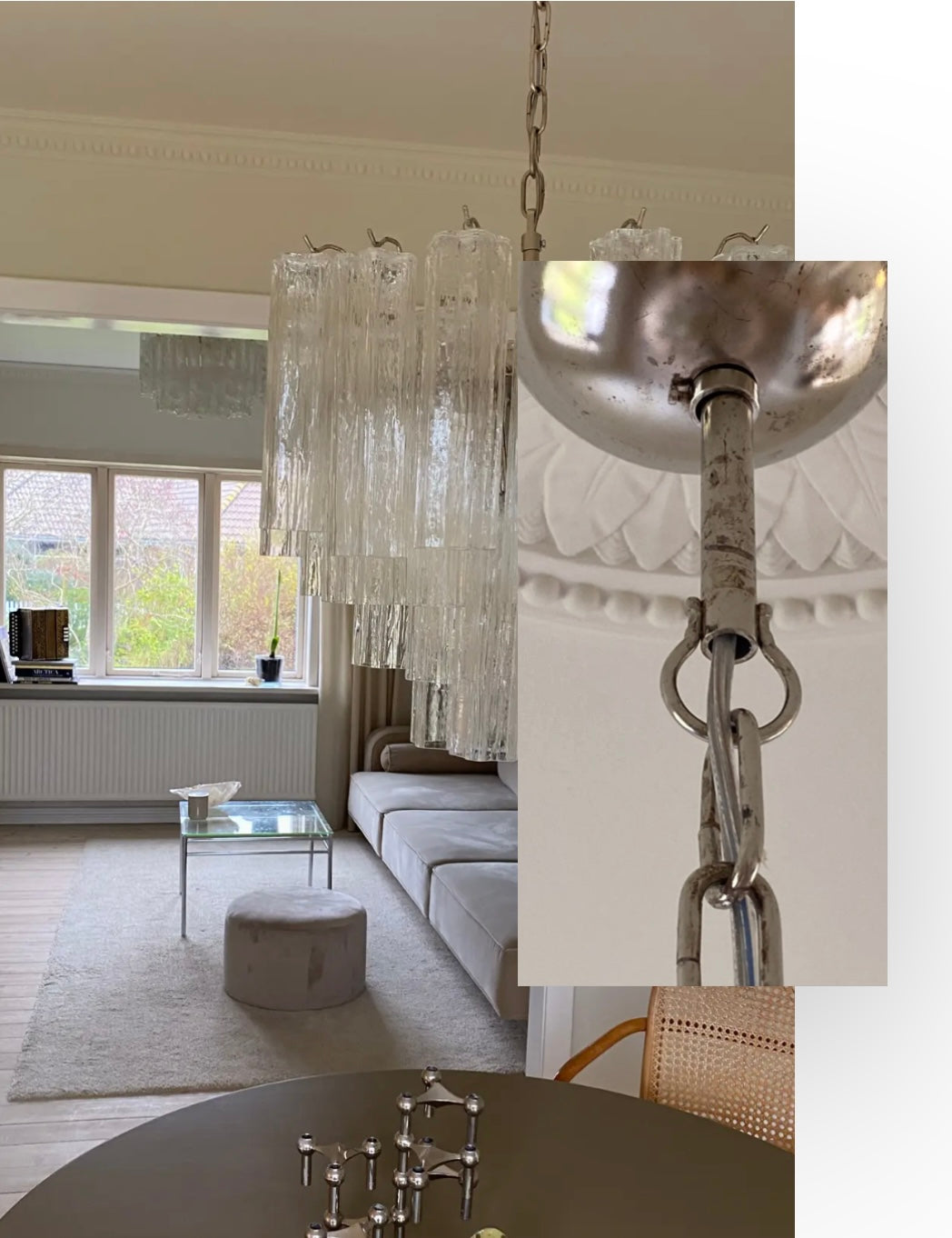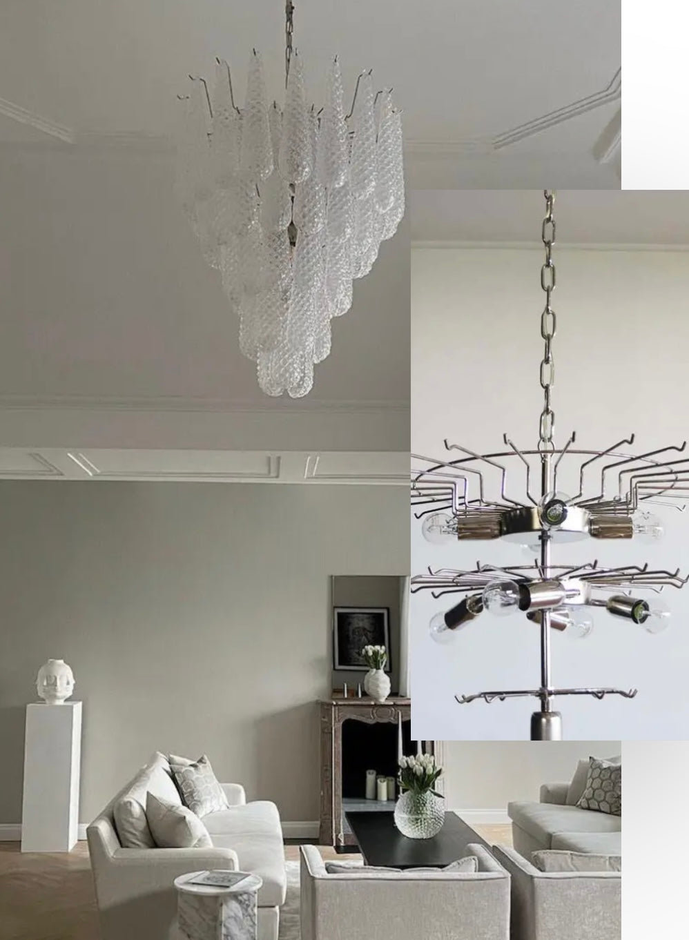 Chrome patinated steel is the standard frame on most of our chandeliers. This frame has natural aging marks/patina. Gives a vintage feel that suits both modern and traditional interiors.